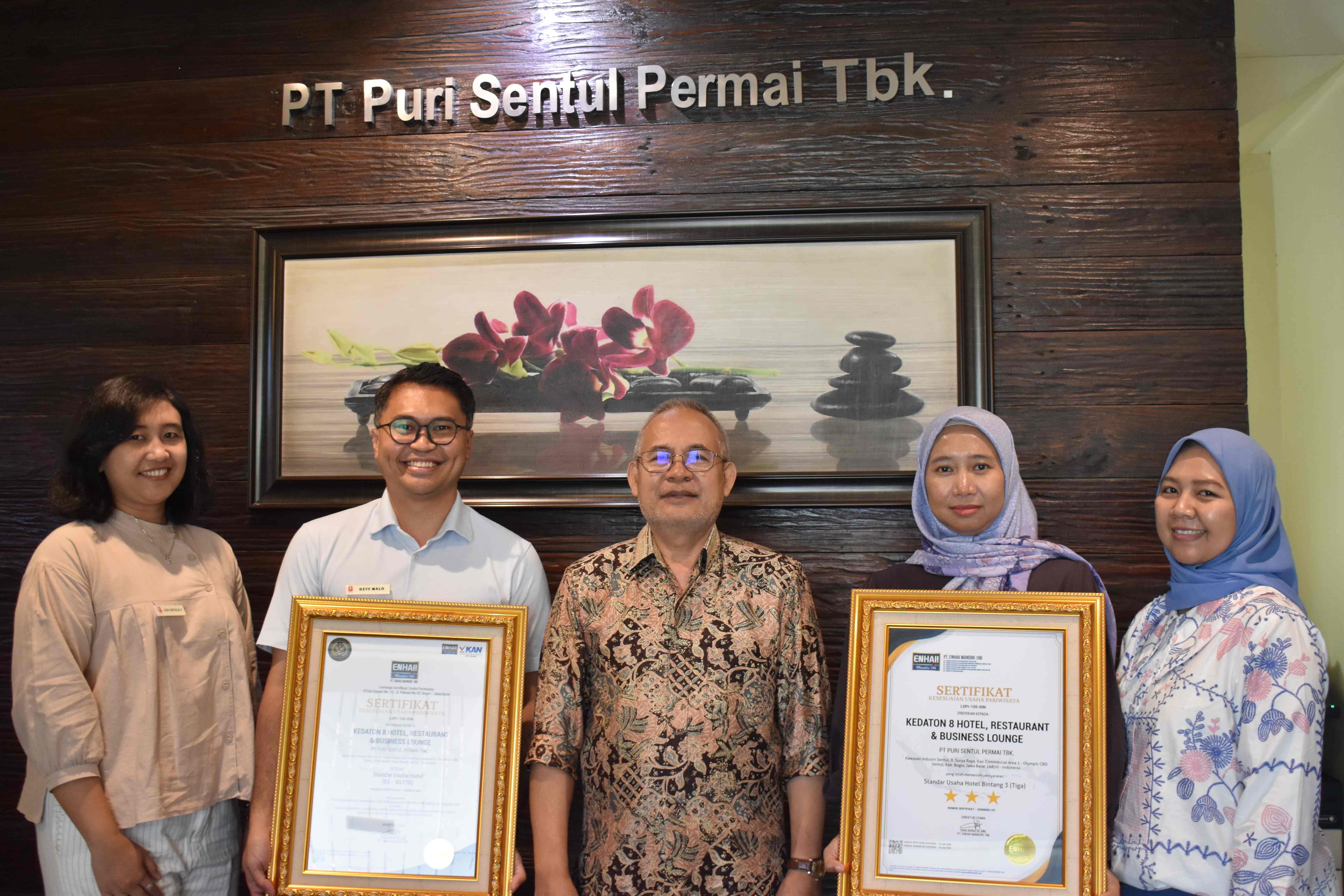 Sentul (04/07/2025) - Kedaton 8 Hotel, unit usaha PT Puri Sentul Permai Tbk, kembali menunjukkan komitmennya dalam menjaga standar layanan perhotelan berkualitas dengan dinyatakan lulus dalam proses sertifikasi hotel bintang tiga oleh Lembaga Sertifikasi Usaha (LSU) Enhaii Mandiri 186, sebuah lembaga independen yang telah terakreditasi oleh Komite Akreditasi Nasional (KAN) dan diakui oleh Kementerian Pariwisata dan Ekonomi Kreatif Republik Indonesia.